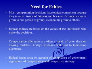 The maximum reward a physician can receive back is 150 percent of his initial "10 percent withheld;" the maximum penalty is a 65 percent loss of the initial 10 percent withheld. The existence of these systems demonstrates both that the U.S. lags behind other nations in its protection of human research subjects and that the establishment of a compensation system is both practical and feasible. The goal of big business is profit. For many years, researchers viewed pay sys tems as an efficient way to bring market-like labour ex changes inside organizations. To accomplish this purpose, I will first discuss relevant background information and ethical tenets that frame the issues. We explore how other countries and certain institutions within the U.S. have adopted various systems of compensation. Ethical performance should be one of the metrics Therefore, in relation to executive compensation, directors, CEOs and senior executives have a fiduciary duty to negotiate and accept a compensation package that is in the best interests of the shareholders (Moriarty 2009, pp. All rights reserved.